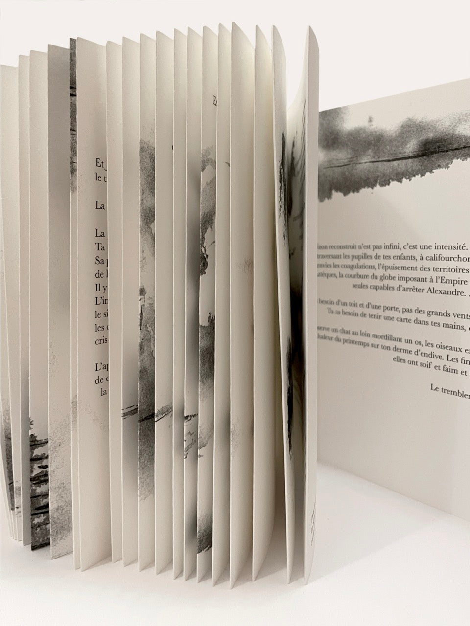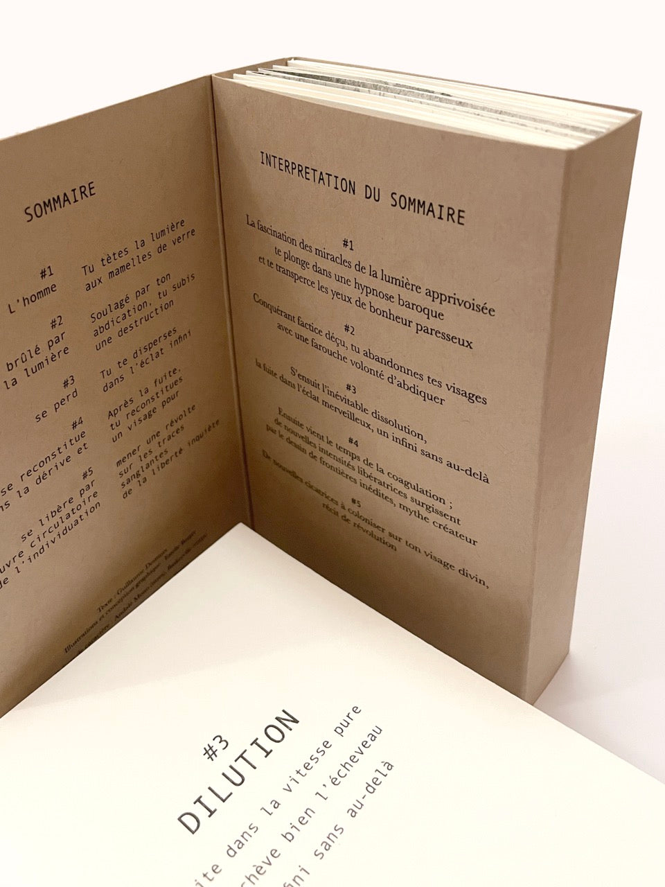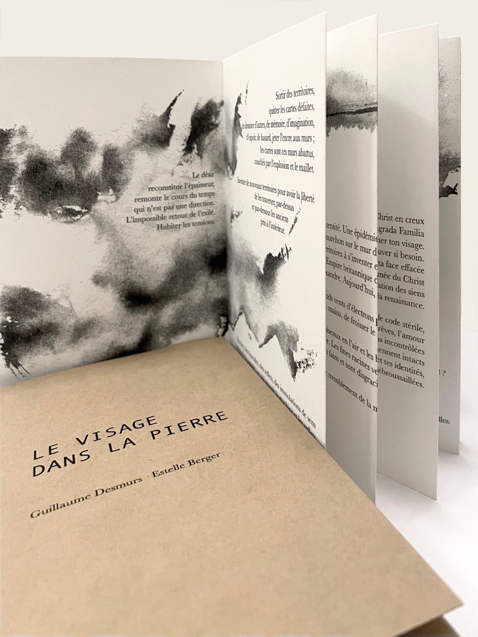 Guillaume Desmurs en signe le texte, Estelle Berger les illustrations à l’encre de Chine et la conception graphique. Cet objet poétique remarquable est imprimé et façonné à la main par Sacrés Caractères dans son atelier de Lyon.